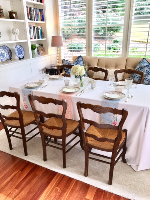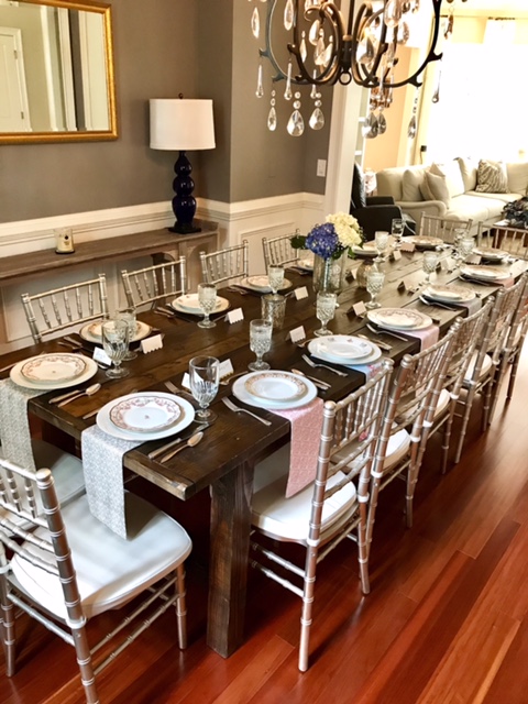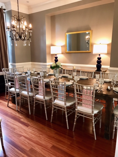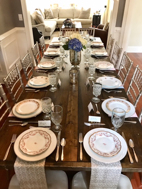 I met Corinna at a Valdosta State University Alumni event. She mentioned she wanted to do a June baptism luncheon event in her Atlanta home for her daughter and we quickly set a time to meet. Corinna and I brainstormed the theme of the party and I quickly knew the perfect vendors for this perfect baptism luncheon. She wanted a farmhouse look with a classic flair and of course hydrangeas! Present Time Rentals had the perfect table to create the vision we were looking for. We also incorporated their silver Chivari chairs. I love the way this table turned out with the mix matched china provided by The Prissy Plate Company. I had a mixture of vases to include with creating blue and white hydrangea centerpieces. Maggianos catering was the perfect meal for this occasion. Baby Quinn was surrounded by her friends and family for this very special luncheon to celebrate her baptism.