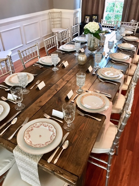 Beautiful farmhouse table by Presentime Rentals and mix matched china by The Prissy Plate Company. Florals and Event Planning by In An Instant, LLC.
